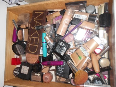 | My makeup drawer. Full disclosure: I also have a rather large pink plastic tub full of “special occasion” makeup under the sink |