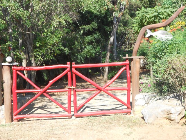 | A bright red gate off the dirt road in Troncones |