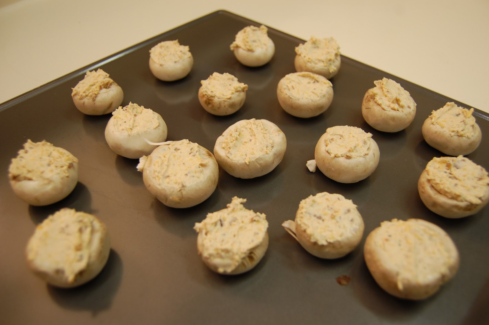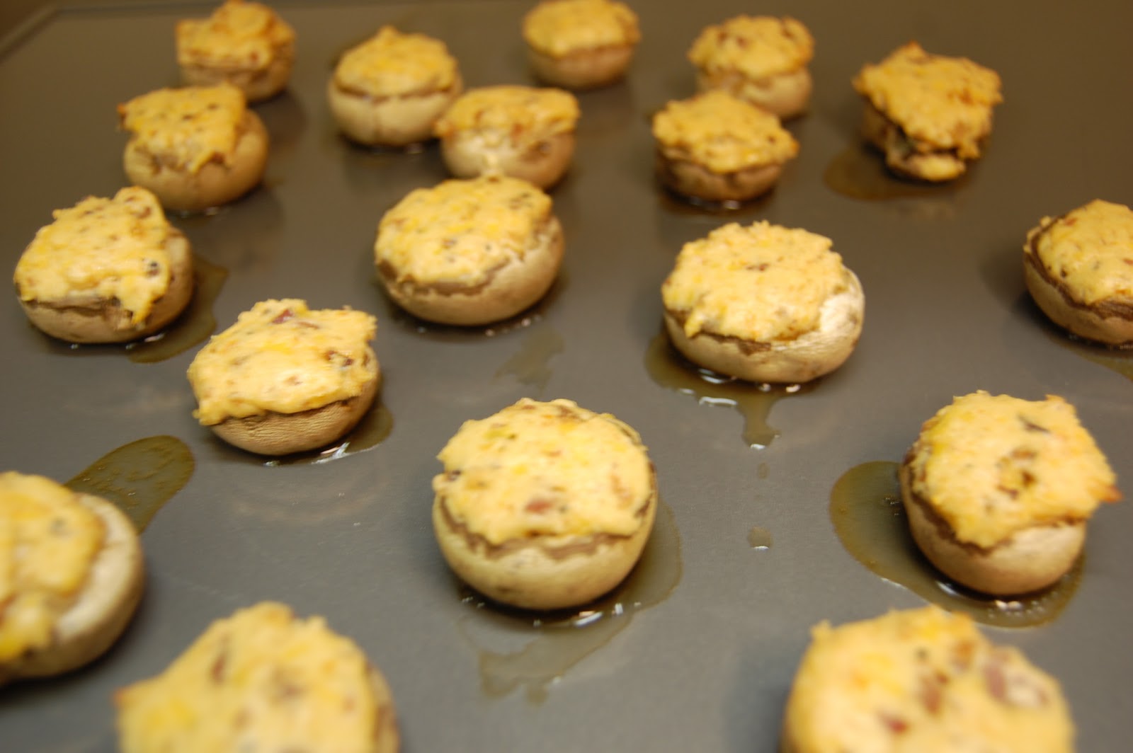 Pull the stems out of the mushrooms and stuff. Place on a cookie sheet and bake at 350 degrees approximately 20 minutes, or until juice from mushrooms begins to evaporate and harden onto cookie sheet.