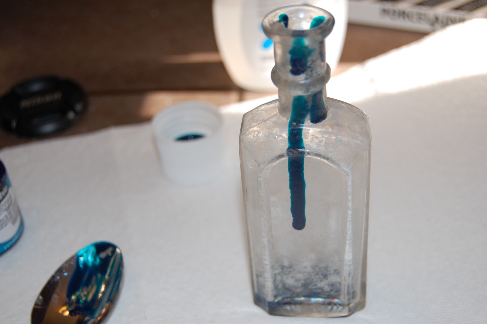 The instructions say to mix the paint with a bit of paint thinner to make it easier to coat the inside, but I found when I did that, even a tiny bit, when I left it to dry, the paint would run and leave rivulets in the blue. So I waited for it to dry completely, and then dumped the paint in undiluted, it took a bit more time and effort to get the whole inside of the jar covered, but once I did, I was able to dump the excess back into the jar, and let it dry without runs or streaks.