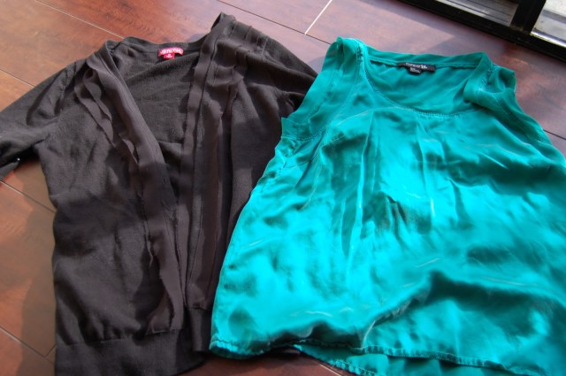 I’ve been seeing a lot of cute sweaters with elbow patches lately, so I decided to try to make one of my own. I bought this green shirt at Forever 21 a couple of years ago, because I absolutely loved the colour, but it never really looked right on me, and I was going to get rid of it in my spring closet clean out. Instead, I used it to make some patches for my favourite black cardigan.