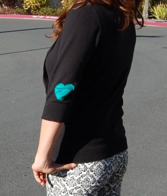 Then I put the cardigan on, and marked the center of my elbow with a pen, and sewed on the patches.