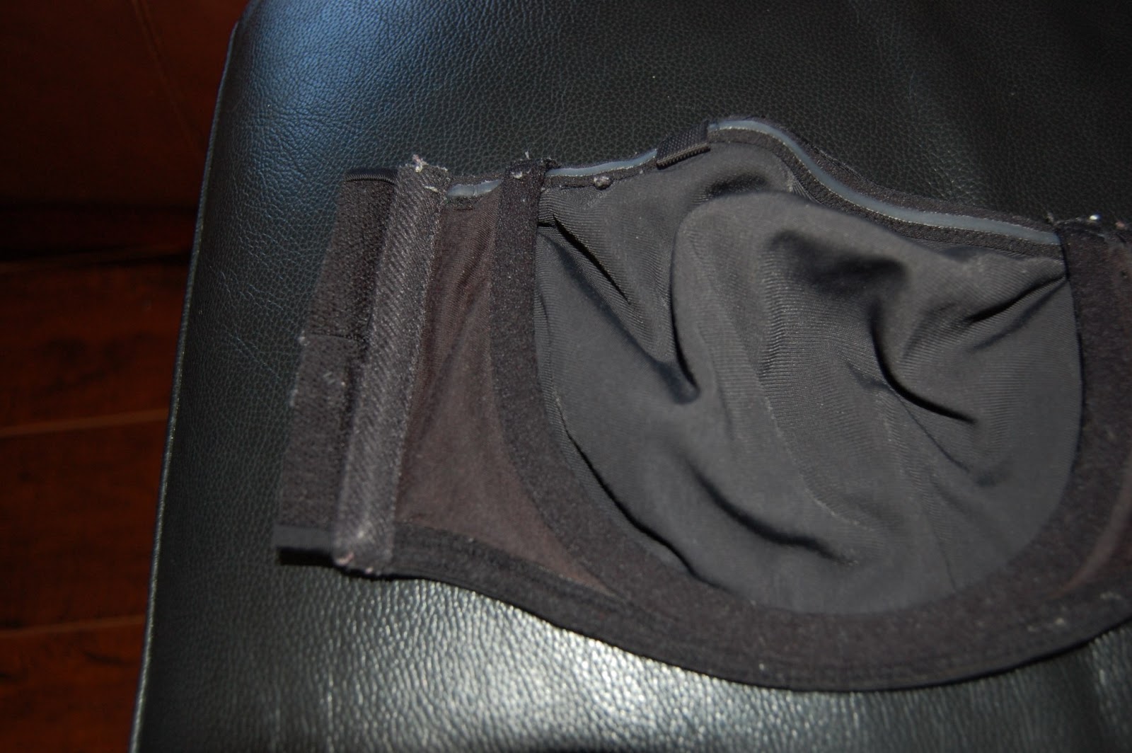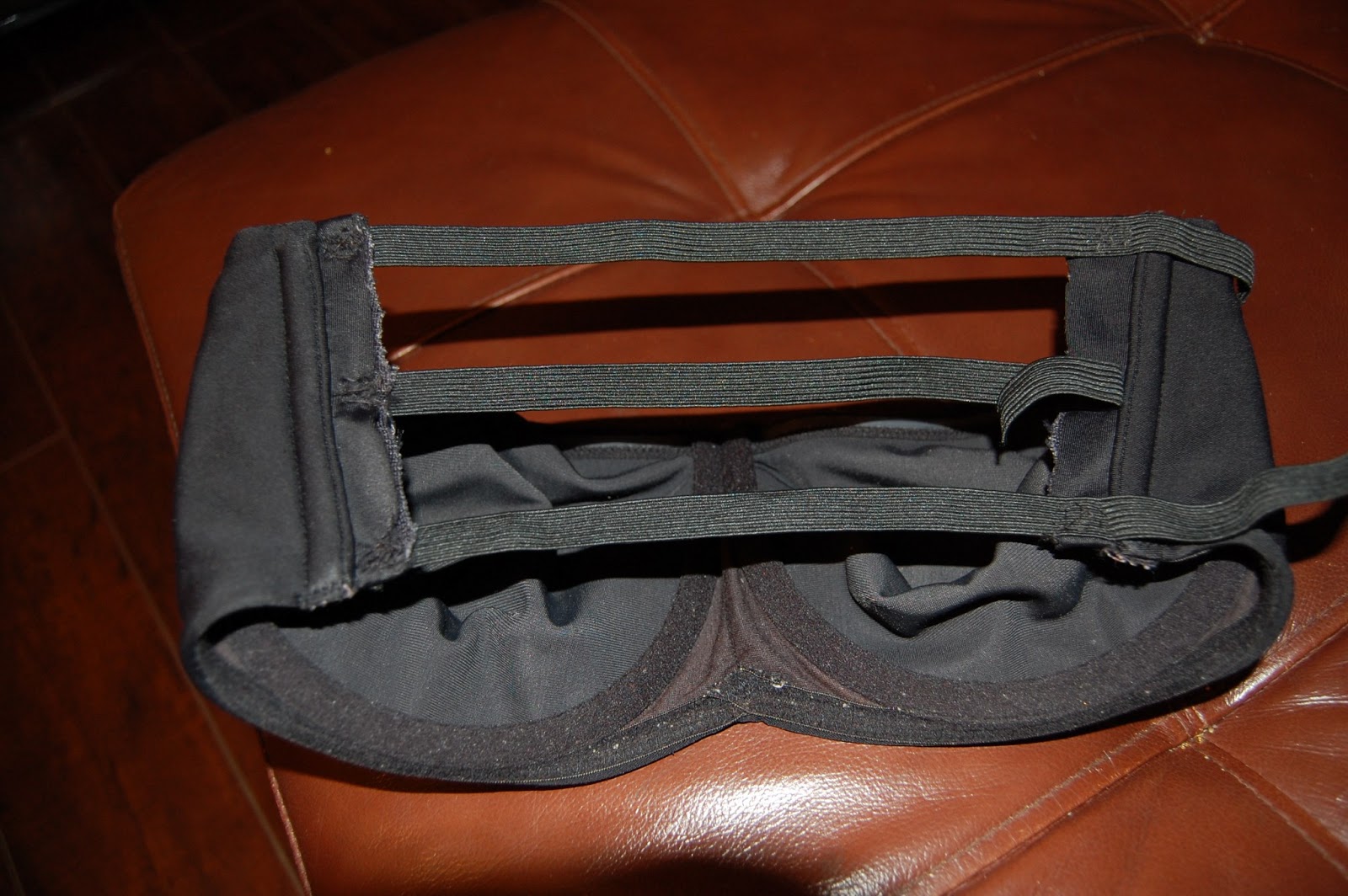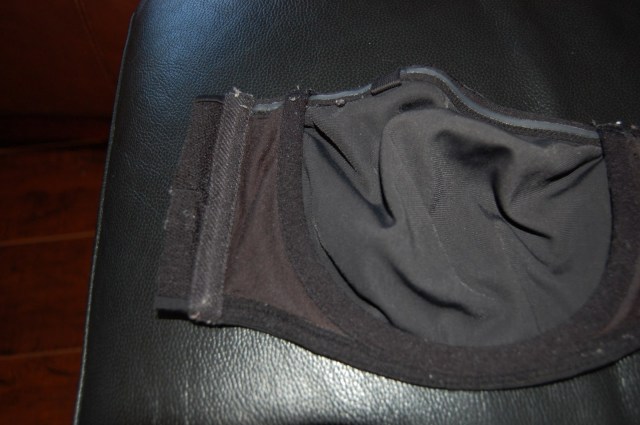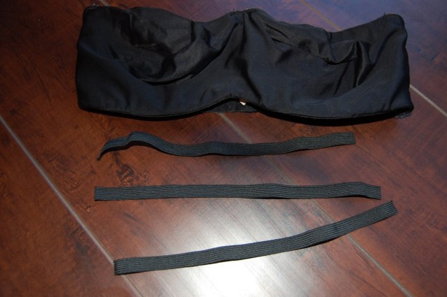 So this is how I would wear a backless dress. I got some pretty heavy duty elastic from Michael’s, and my favourite bra. I cut off the back of the bra, leaving about an inch on each side of the cup to attach the elastic to, and sewed on 3 strips of the elastic on one side.