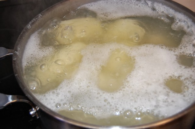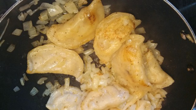 Luckily I made way too much bacon and had about a pound left over to nibble on to give me sustenance through this arduous task. Once the perogies are done, I boil them in hot water until they float, then saute them with butter and onions until they are brown.